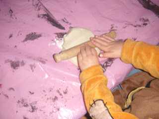 We started a theme around Christmas with special focus and measuring, weighing, estimating sizes, volumes, counting, etc. Our first activity was measuring the ingredients for saltdough and making saltdough cookies for the pretend playzone. The cookies are already used for counting or estimating e.g. “how many do you thing will fit in this box?”.